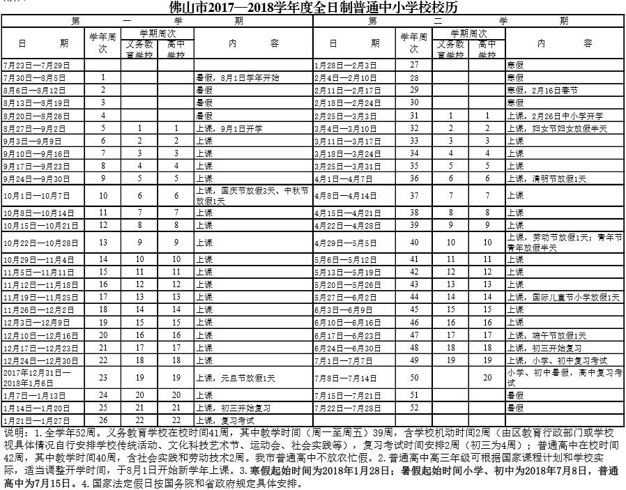 佛山市2017-2018学年度全日制中小学、中等职业学校校历