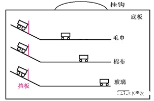 说明:三条跑道均粘在底板上,跑道侧面有护栏,防止小车滑落,挂钩可使装置挂在黑板上。跑道、挡板、底板都采用有机玻璃。