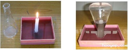 将小段蜡烛点燃,在小盘中央滴几滴刚熔化的蜡,迅速将点燃的蜡烛固定在上面。在盘中加入少量黑色水,深约1cm。将玻璃杯倒置在水中,罩住蜡烛(图a)。等水被压入杯内(图b)。