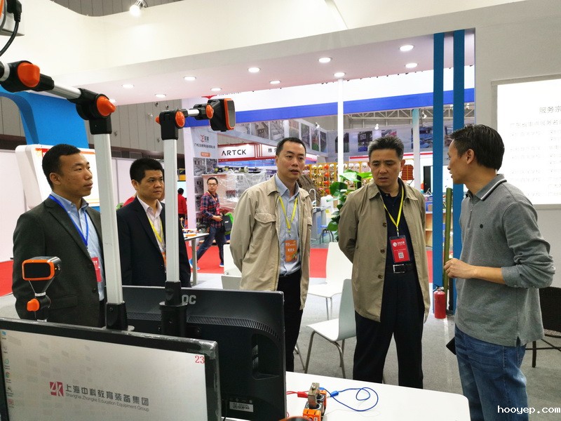 伟德betvlctor的客服平台党组书记、局长商学兵(右二)在省教育装备行业协会会长陈学机(左二)陪同下参观展览会