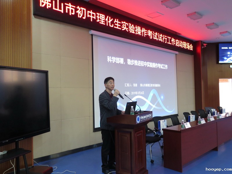 3月26、28日,佛山市初中理化生实验操作考试试行工作启动现场会暨理化生实验操作考试专题培训会在顺德区京师励耘实验学校成功举行。广东省教育厅副巡视员邱克楠、省教育装备中心主任彭红光、省教育装备中心副调研员詹奇、中国教育装备行业协会城市教育装备工作委员会副理事长兼秘书长,太原市教育装备中心原主任许原芝、全市包括教育装备工作分管局领导、主管基础教育、督导、人事(监察)、装备、招生、教研、安保、信息中心工作的科室负责人代表等组成的市、区实验操作考试工作领导小组全体成员,全市初级中学分管教育装备工作的副校长和理化生实验操作考试负责人等合共200多人参加了26日上午举行的工作启动现场会。