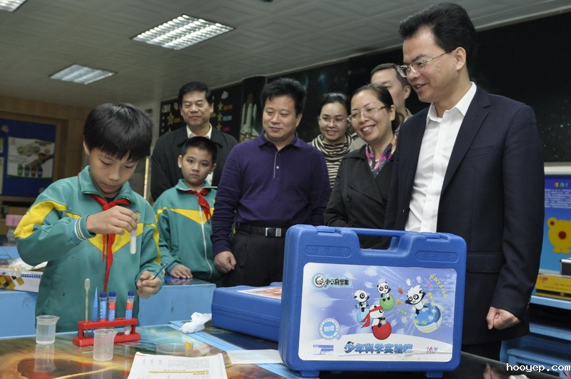 在佛山市同济小学,市教育局毛局长一行在禅城区教育局副局长龙祖军等人陪同下,参观了中国少年科学院优秀科普教育示范基地、全市首个科协系统认定的小学科技创新实验室。听取了该校依托实验室所建立的“童童少年科学院”发展情况。当了解到目前已有十四名学生被中国少年科学院授予全国“小院士”称号,并逐—观看和体验了“小院士”们所开展的物理、化学、生物、天文、小机器人、汽车物联网的创新实验和自主创新作品演示后,毛局长对同济小学给予了充分肯定,他鼓励师生们多参与科学实验活动,为进一步提高创新实践能力奠定坚实的基础。