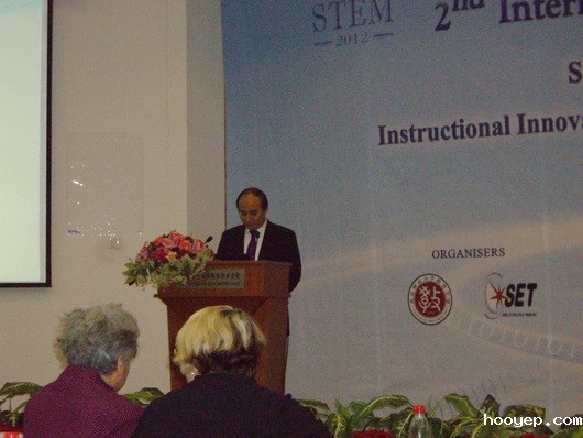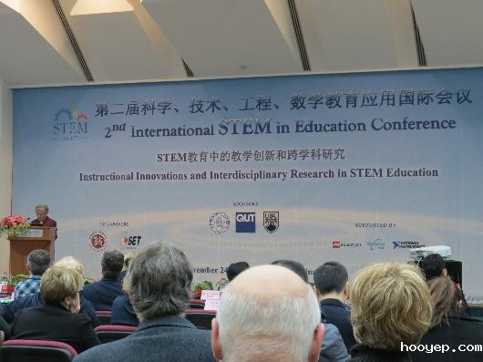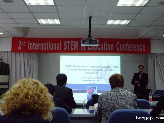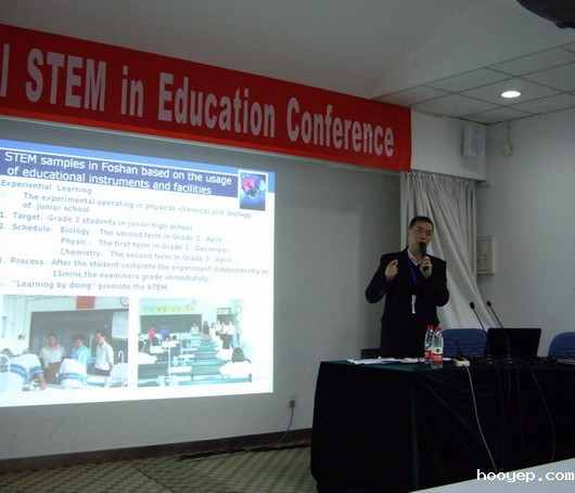 STEM是英文Science、Technology、Engineering、Mathematics的简称,STEM教育已纳入美国奥巴马政府的教育创新行动计划中,并成为欧美各国复合型创新人才培养的重要理论依据和学科教育改革发展方向。本次大会主题是“STEM教育中的教学创新和跨学科研究”,旨在促进与会者共同分享该领域最新研究成果、研究进展及创新思想。会议分为主题报告会、论文报告会、分组研讨会等多种形式。应组委会的邀请,我市作为中国地区唯一地级市教育部门代表在分组研讨会上作专题发言。11月25日,受局领导的委托,市教育局电教站副站长区建峰在会上作了题为《STEM Penetration in Applied Exploration and Creative Practice for Regional Education Equipment》(《融合STEM教育理念的地区级教育装备应用探索与创新实践》)的专题报告,用中英文向海内外来宾介绍了中美复合型创新人才发展的教育策略比较,结合STEM教育理念逐步融入我国中小学学科教育实践的可行性思考,进一步介绍了中国佛山地区在优化提升教育装备建设,促进学习者全面发展过程中,如何发挥教育装备的认知建构功能、实践体验功能、创新设计功能、项目学习功能、个性发展功能等作用,以及相应开展的诸如全市试行初中实验操作考查、编制教育装备建设指南、引进多元智能装备、开展教育装备国际化合作、组织师生自制教具和实验能力大赛、协助组织佛山教博会体验式教育装备展等综合应用探索与创新实践案例。