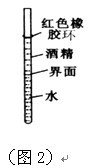 (2)先向玻璃管内倒入约40cm高的水(水中可加少量品红),然后缓缓倒入约40cm高的酒精。把红色橡皮套移到上液面处,仔细观察水和酒精交界处有一明显的界面。
