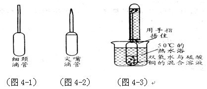 (3)将1支小试管装满水,用手指堵住试管口,试管口朝下,将滴管的细颈端插入小试管,收集氧气,(如图4-3)。收集满后,换另一支装满水的试管进行收集,直至滴管内没有气泡产生为止。