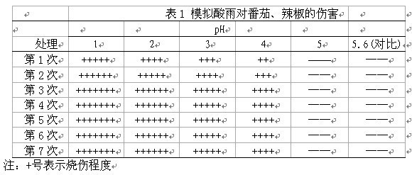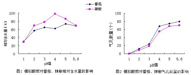 实验一结果表明,随着模拟酸雨PH值的降低,植物受伤害的程度逐渐加深,气孔的数量也逐渐减少了,叶片的含水量也随着pH值的降低而减少,但恰当的酸雨对植物的生长有促进作用。实验二结果表明,随着模拟酸雨PH值的降低,植物种子的萌发率越低,但恰当的酸雨对种子的萌发有促进作用。