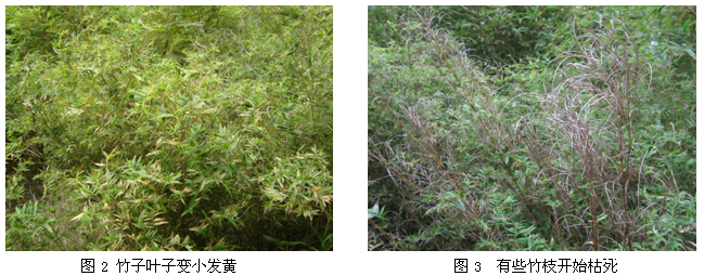 当竹子染上竹丛枝病时,竹子优势衰弱,病枝的节数增多,叶形变小发黄,秋后病枝多数枯死。这种病竹如果不及时治疗,几年内将会全部枝条染病,逐渐全株竹子枯死。