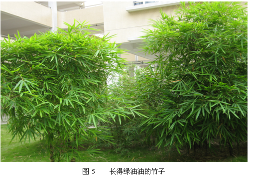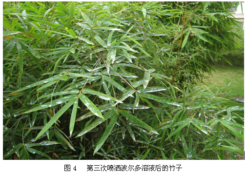 ⑵次日中午,我们到竹子林观察竹子,发现并没有产生药害。过了5天,我们又建议校园绿化植物养护员用上述方法用波尔多溶液喷洒竹子,继续观察是否会对竹子产生药害。
