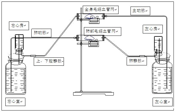 用无色透明饮料瓶模拟心脏,直型硬质玻璃管模拟毛细血管网,无色透明软管模拟血管,心脏与血管之间以导管连接。