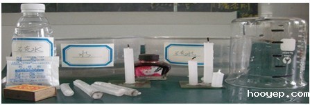二、精心——精心准备器材、药物大玻璃杯四个、8根蜡烛(有长短)、四个汤碗、数张小贴纸(用来做水位上升的记号)、吃了饼干后获取的干燥剂(生石灰)加足量的水配成的澄清石灰水、水、红墨水(用于方便观察现象)。下图一是学生在学校的展示实验的主要仪器和药物: