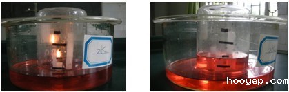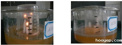 三支蜡烛燃烧消耗容器内氧气,用水吸收蜡烛燃烧生成的气体(下图四) | 蜡烛燃烧一会后,燃着的蜡烛由高到低逐渐熄灭,玻璃杯冷却后,杯内液面上升,比燃烧一根蜡烛的现象(图三)要明显很多,但很接近1/5。 |