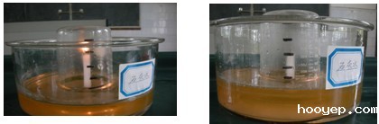 三支蜡烛燃烧消耗容器内氧气,用石灰水吸收蜡烛燃烧生成的气体(下图六) | 蜡烛燃烧一会后,燃着的蜡烛由高到低逐渐熄灭,玻璃杯冷却后,杯内液面出现“白膜”并且液面上升,比图四和图五要明显得多,且接近1/5,与教材中的结论相吻合。 |