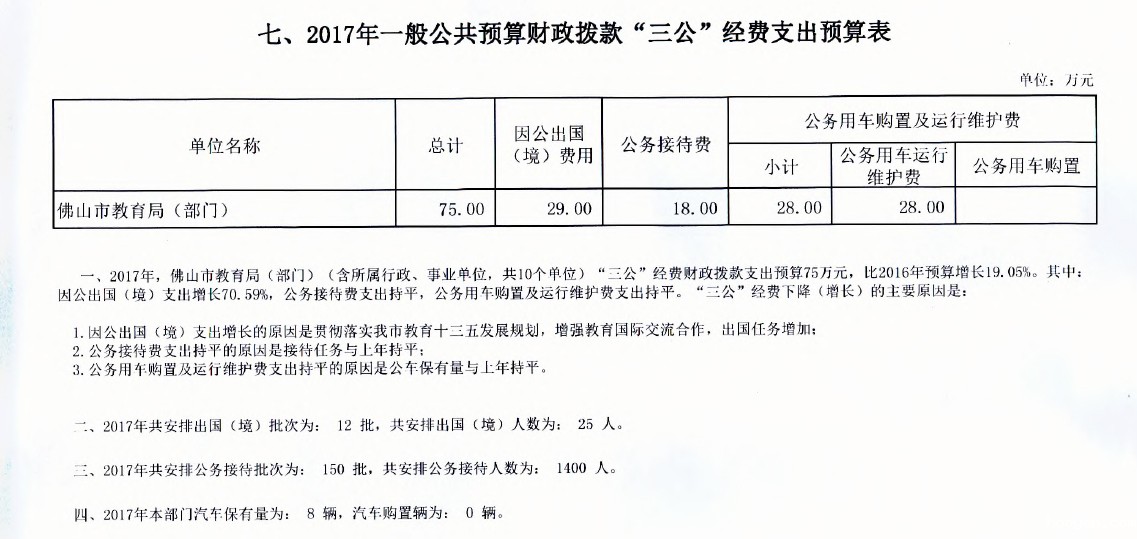 2017年 “三公”经费财政拨款预算合计75万元(详见表七)。其中:因公出国(境)经费预算29万元,占38.67%;公务用车购置及运行费预算28万元(包括:公务用车购置费0万元、公务用车运行费28万元),占37.33%;公务接待费预算18万元,占24%。